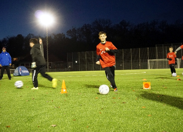 Auf dem neuen Kunstrasenplatz an der Sportanlage Dicke Buche boten sich trotz winterlicher Temperaturen beste Bedingungen für ein abwechslungsreiches und interessantes Trainingsprogramm, das von Manni Binz und Clemens Appel von der Eintracht Frankfurt Fußballschule fachmännisch begleitet wurde.