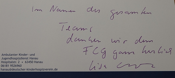 Der FC Germania 08 Dörnigheim e.V. denkt auch an diese Kinder. Deshalb wurde anlässlich des Tag der Kinderhospiz am 10.02.2017 ein Trainingsspiel der C- und B-Jugend veranstaltet. Die Einnahmen aus dem Außenverkauf kommen dem Hospizdienst zugute. Auch viele weitere Jugendmannschaften der Germania bekunden ihre Solidarität in dem sie die grünen Bändchen zeigen. Die Soma-Abteilung und die Senioren-Teams spenden ebenfalls aus ihren Kassen Insgesamt können dem Kinderhospizdienst Hanau 550 € übergeben werden.
