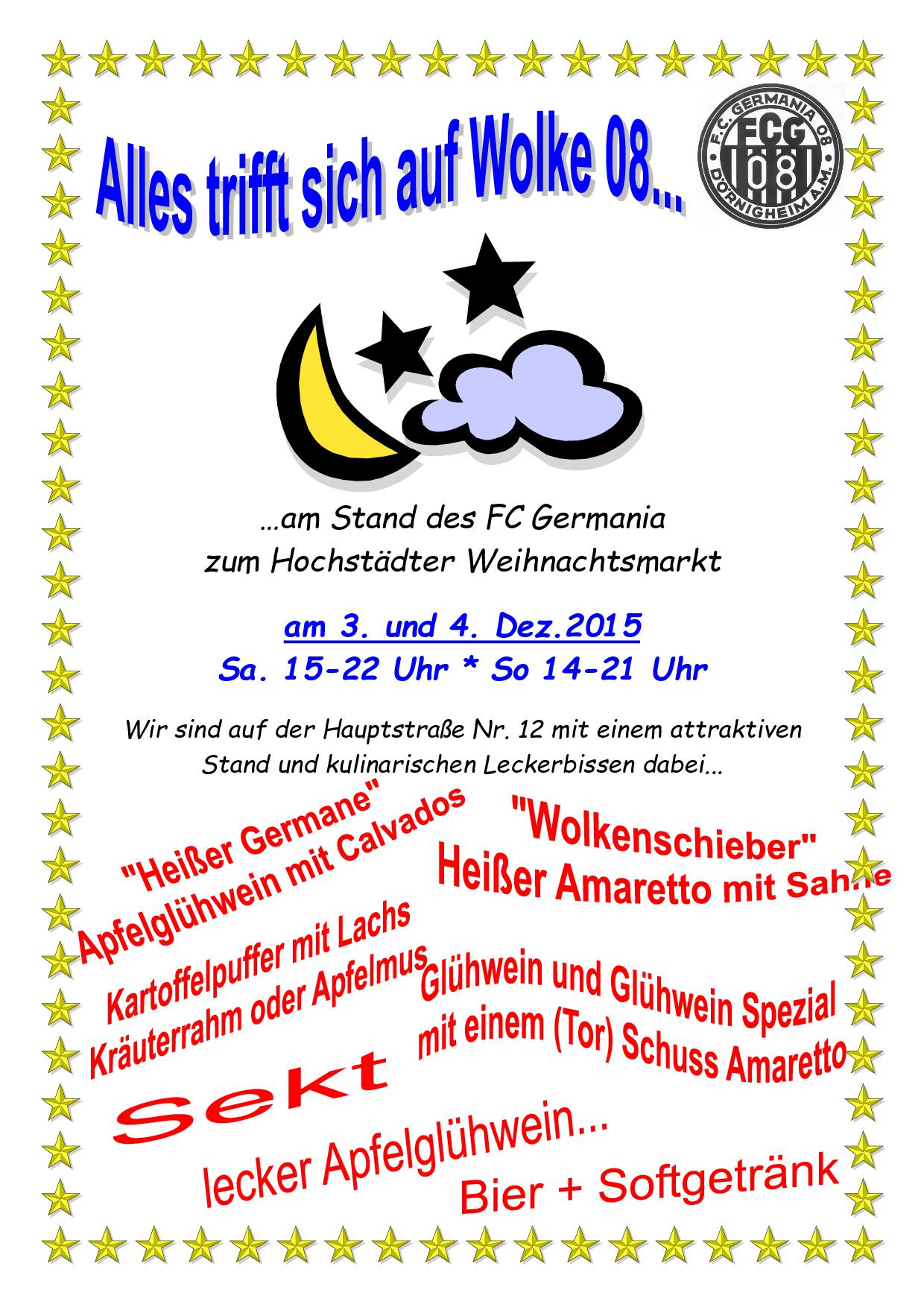 Auch in diesem Jahr ist der FC Germania 08 Dörnigheim auf dem Hochstädter Weihnachtsmarkt am 3. und 4. Dezember wieder mit einem Stand vertreten. Der attraktiv dekorierte Stand befindet sich auf der historischen Hauptstraße - dort trifft man sich auf „Wolke 08“. Für angenehme Atmosphäre und ansprechendes Ambiente wird gesorgt, unter anderem mit schwebenden Wolken. Klar, dass auf die Besucher einmal mehr kulinarische Leckerbissen und diverse Getränke warten.