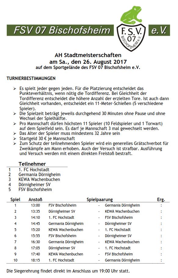 Ankündigung: AH Stadtmeisterschaft am kommenden Samstag, den 26.08.2017 Verfasst am 22. August 2017. Veröffentlicht in SOMA DruckenE-Mail Zurück Weiter